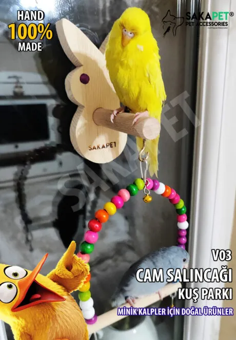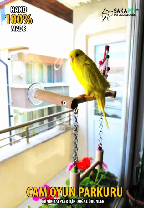 🔹 El yapımı, doğal ahşaptan üretilmiş vantuzlu cam kuş oyun parkurudur.