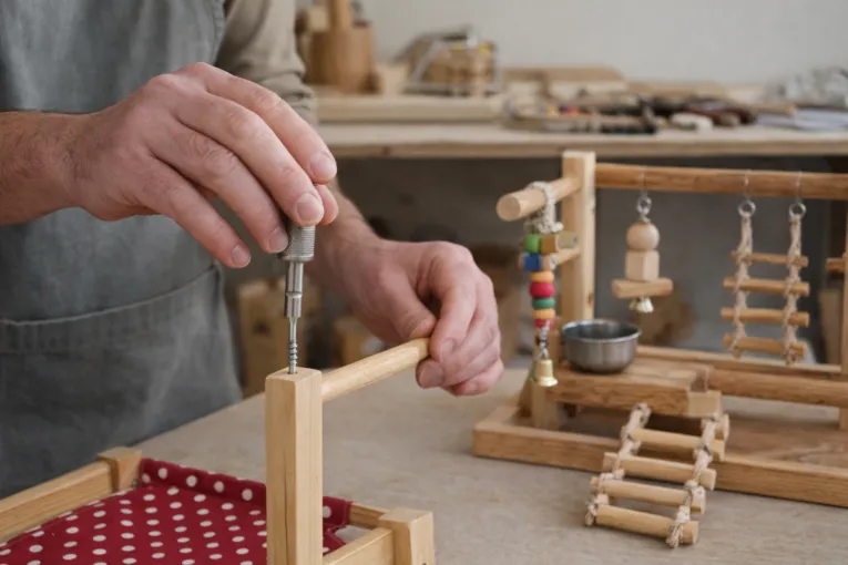 🪵 El yapımı, doğal ahşaptan üretilmiş kafes üstü kuş oyun parkurudur.